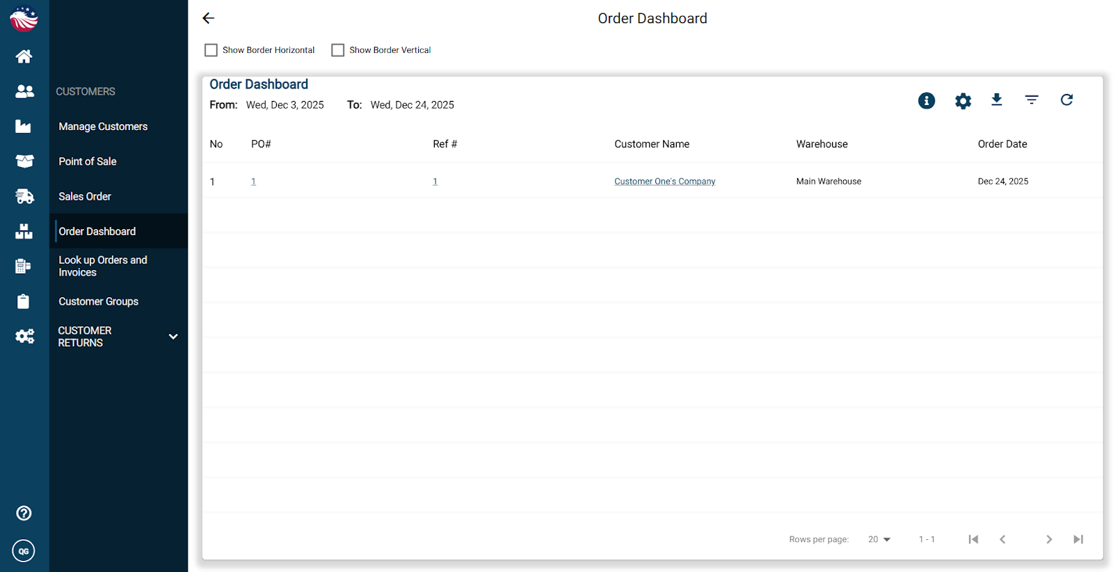 Finally, navigate to Customers > Order Dashboard to see your order. You can scroll right to see more columns, and customize the columns using the gear icon.