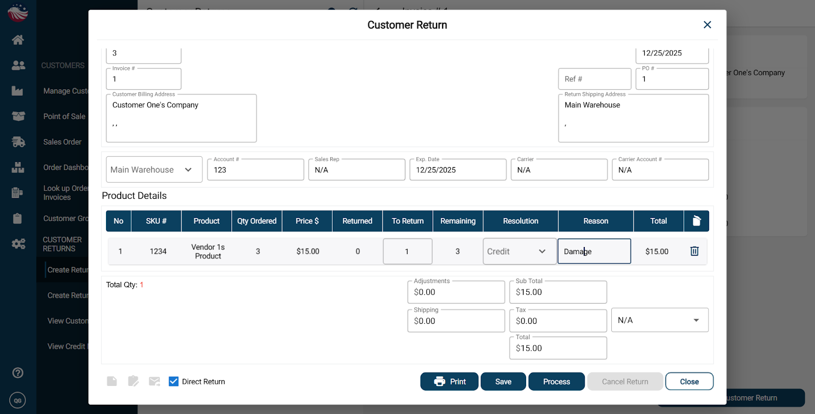 Direct Return option: If you select Direct Return, you skip approval and immediately add the returned items back into stock. For our example, we’re going to have Direct Return checked. We cover non-direct returns in a later guide titled: Handling Returns & Credits.