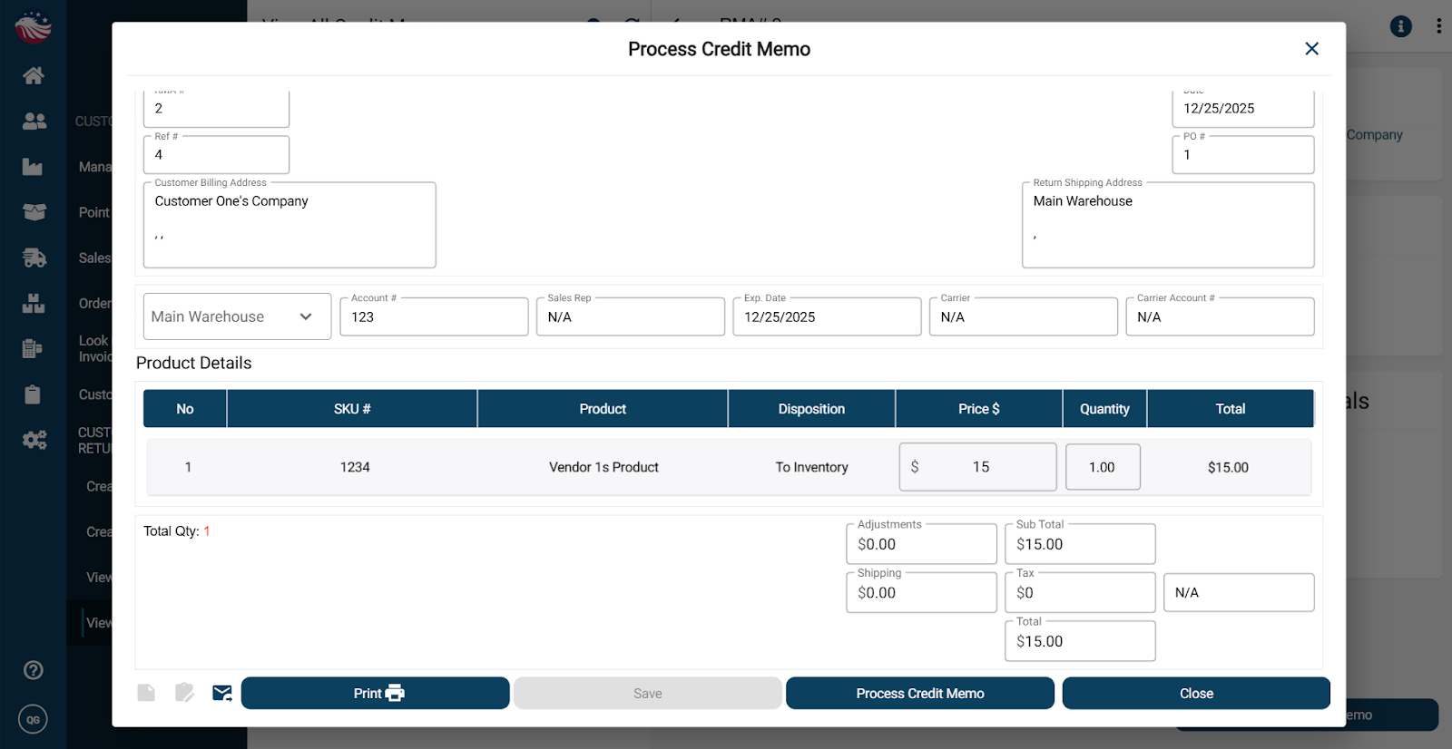 Select the memo and click Process Credit Memo to finalize the credit memo