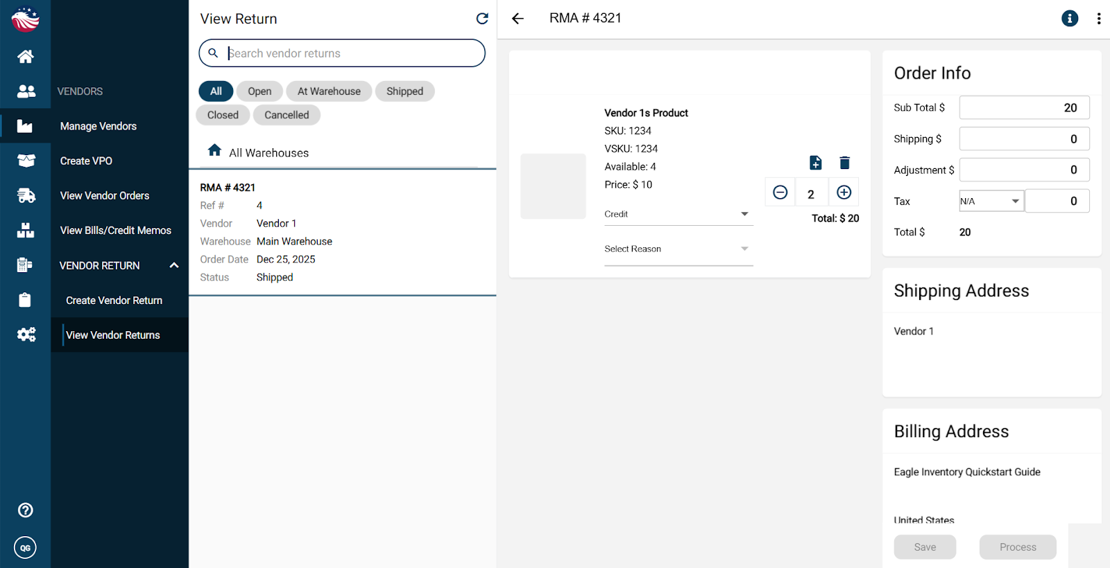 Navigate to Vendors > Vendor Return > View Vendor Returns to confirm the return status (you should see At Warehouse)