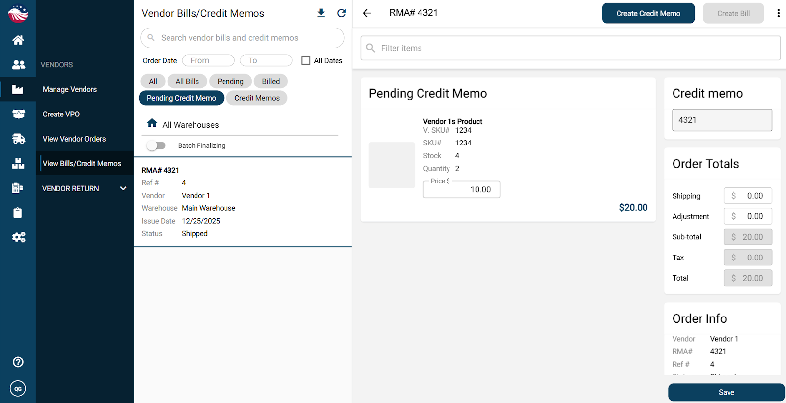 a Pending Credit Memo is created in Vendors > View Bills/Credit Memos