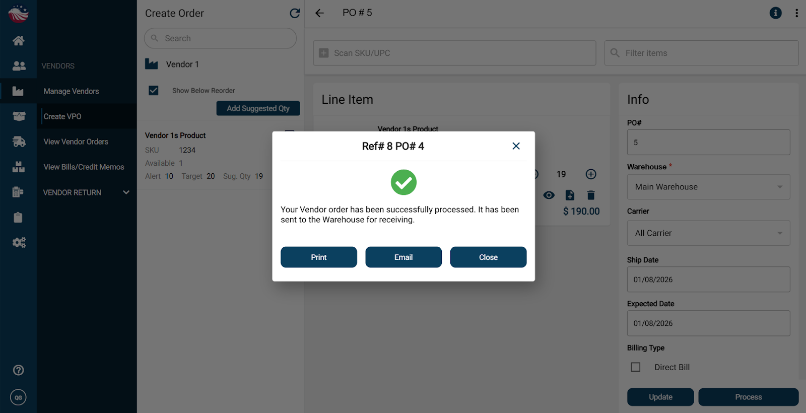 You can now email this order to your vendor. When it arrives, go to Inbound > Inbound Orders, enter the quantity (or click the three dots in the top left, then select Receive All), add a Bill Number, and click Receive.