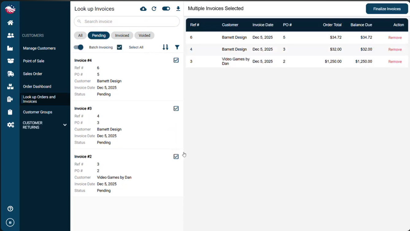 Select multiple pending invoices and click Finalize Invoices.