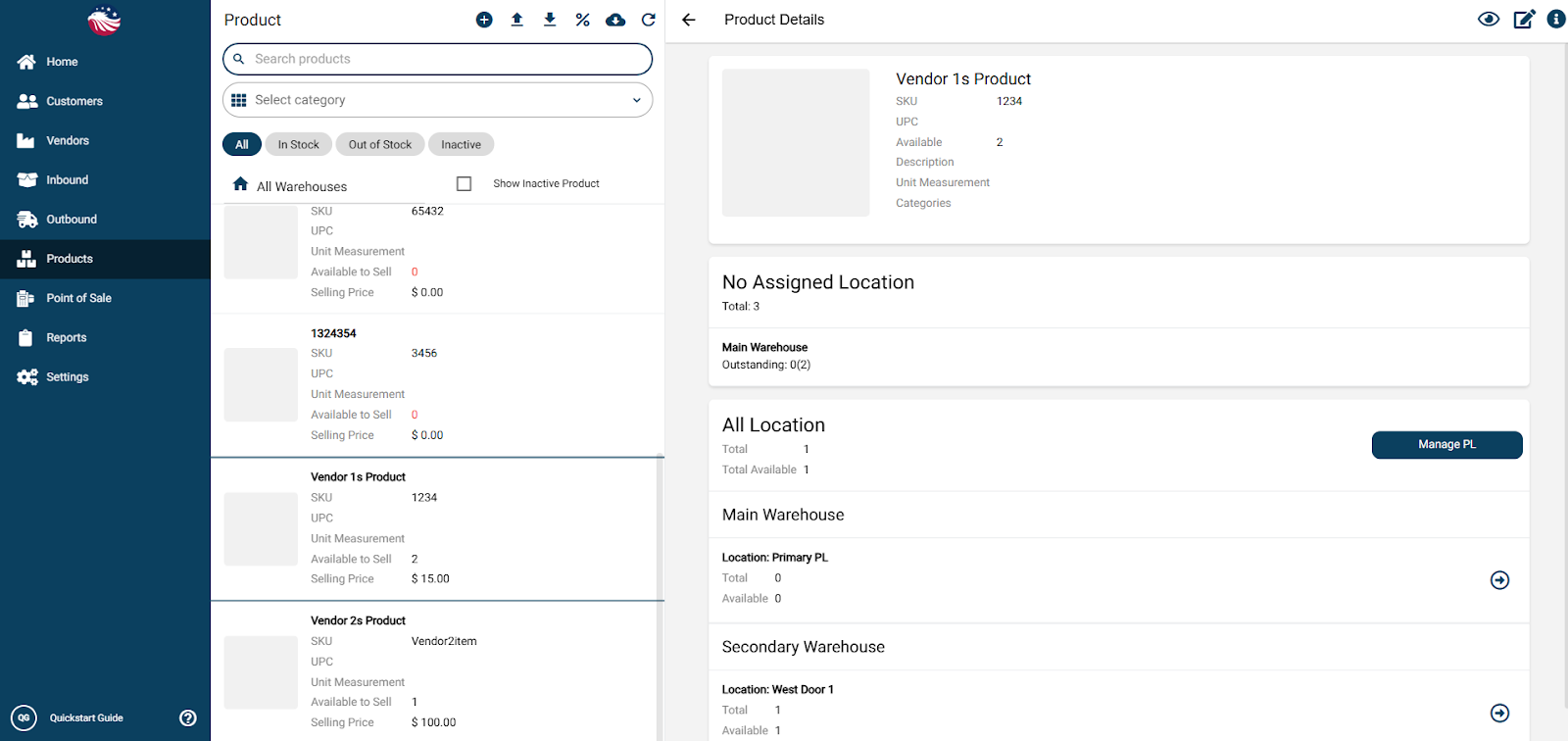 Go to Products > Manage Products, select an item, and click one of Arrow Icon on the right side of the screen for the warehouse you want to move stock from.