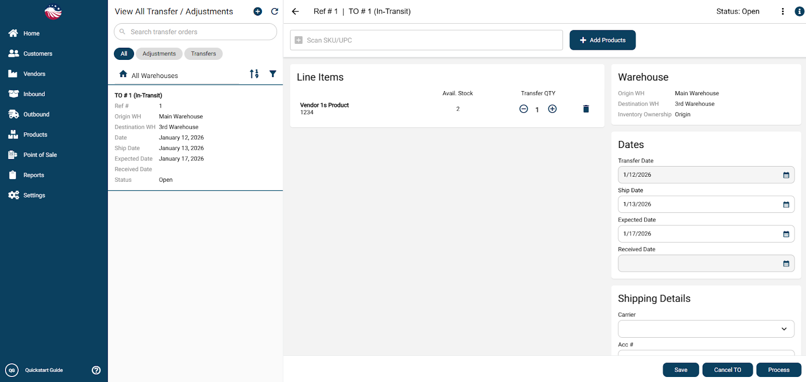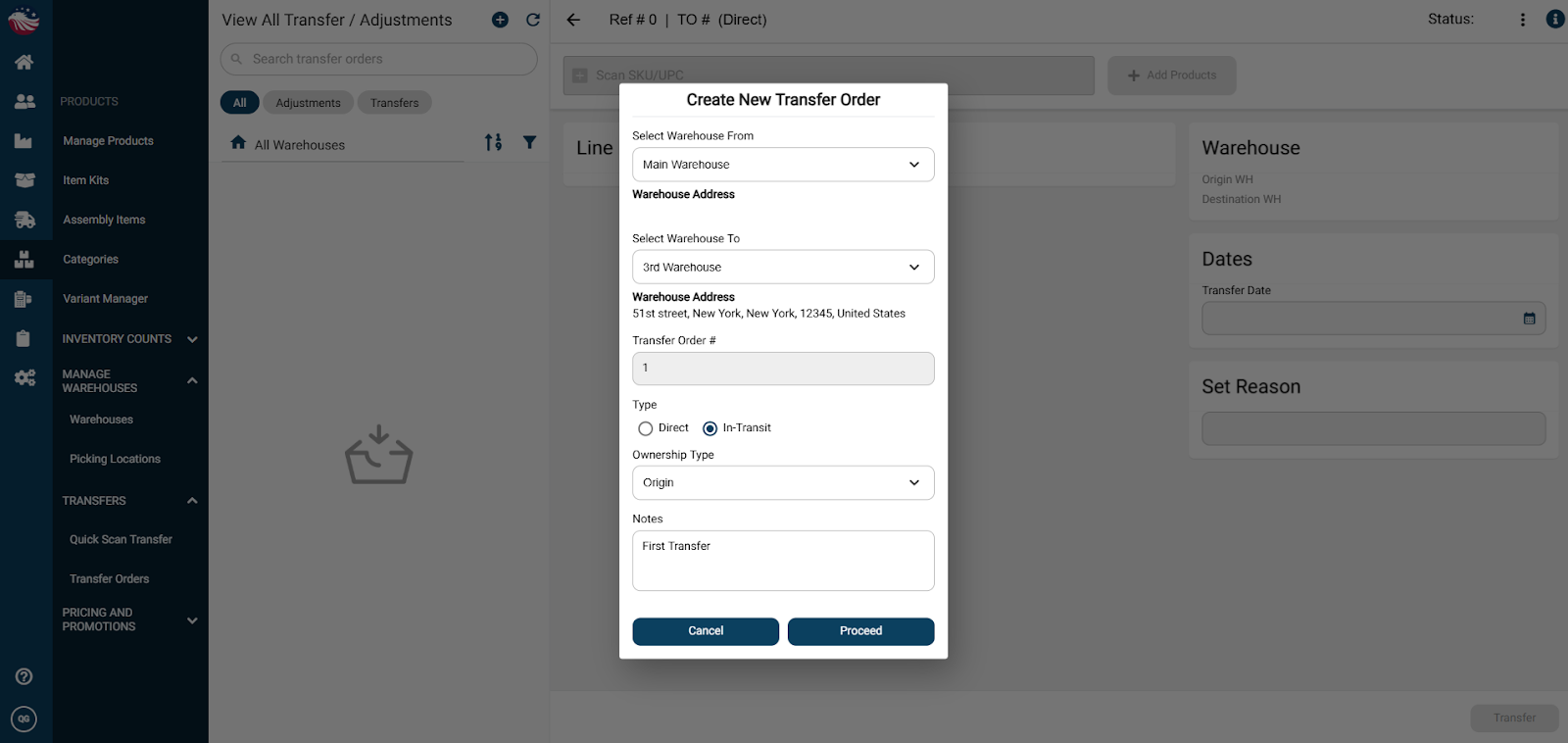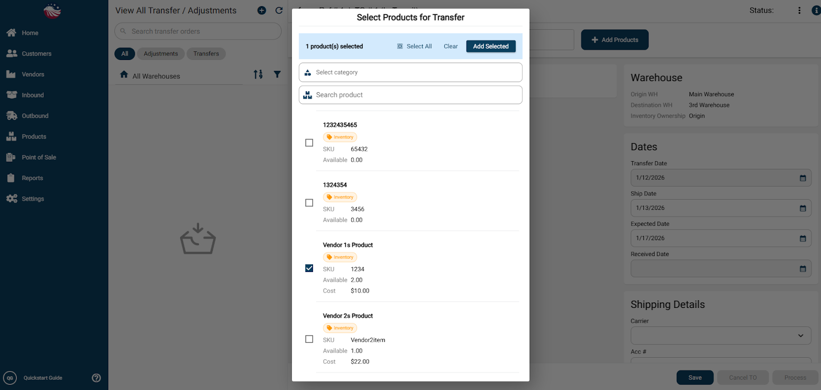 Add products to the transfer either by entering in SKUs, scanning the product, or by hitting the Add Products button and selecting products.