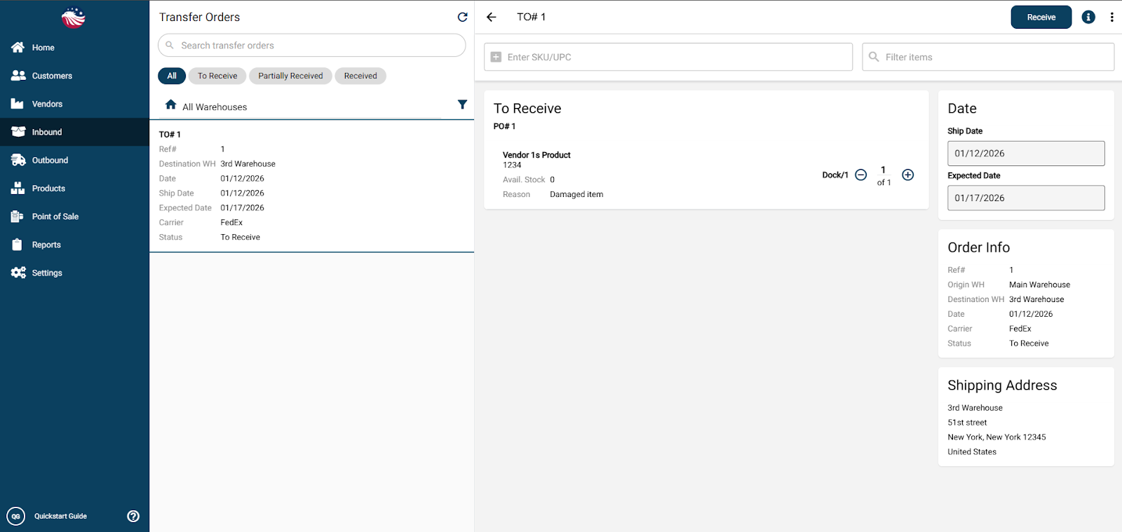 Go to Inbound > Transfers and find the transfer, and Receive it.