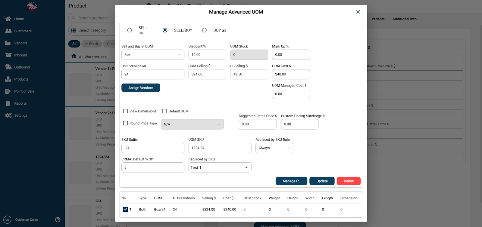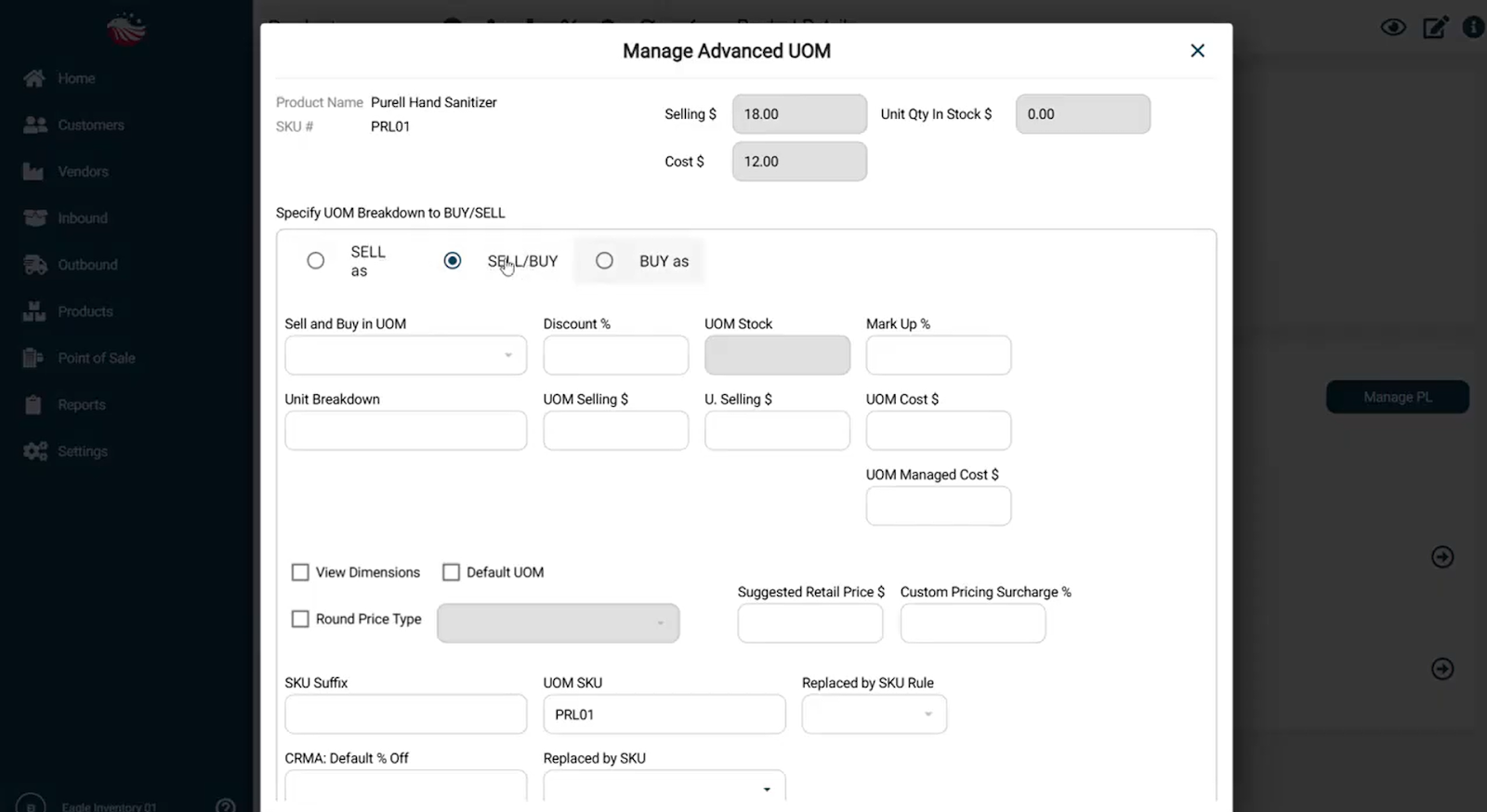 Sell and Buy in UOM: Select the unit type from the dropdown (e.g. Box).