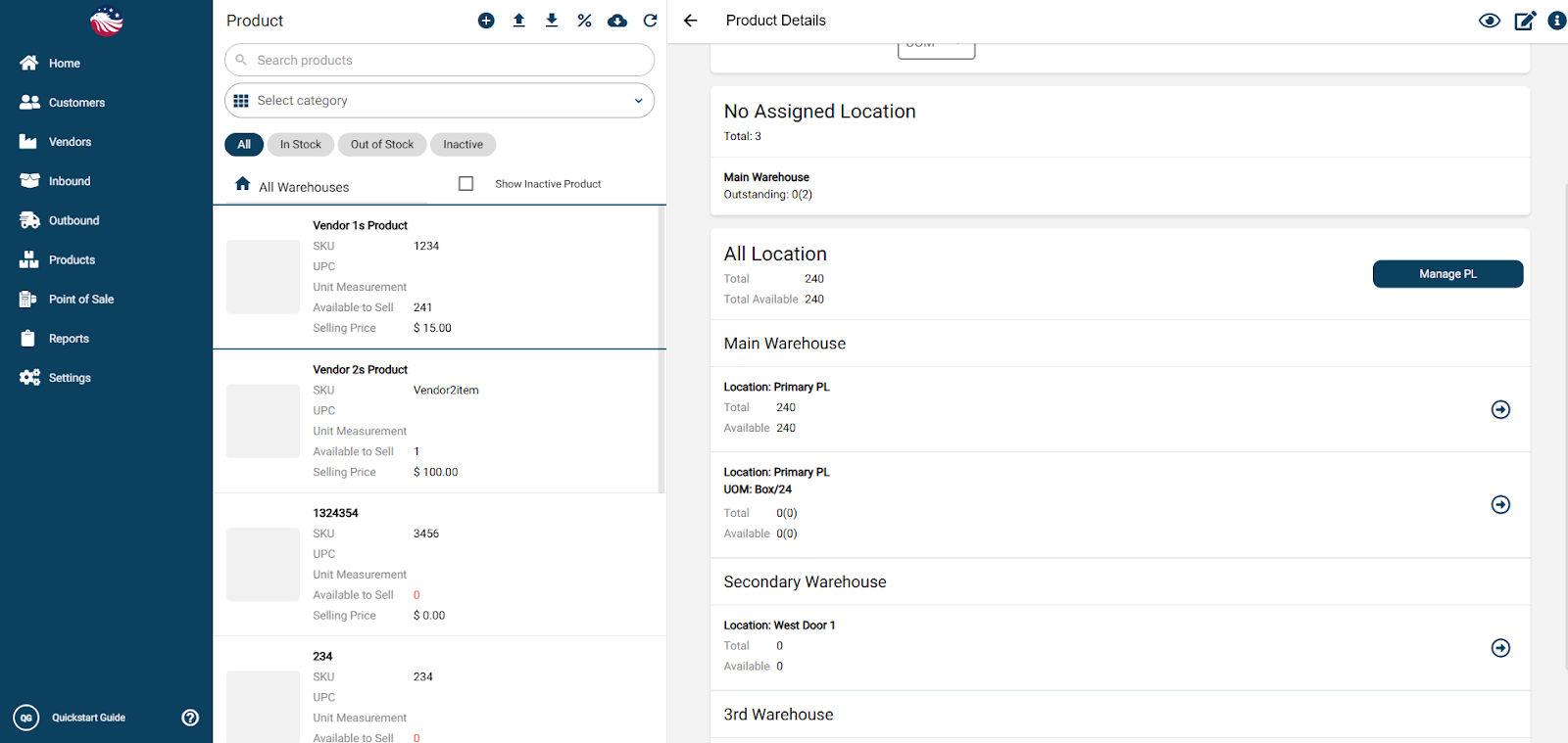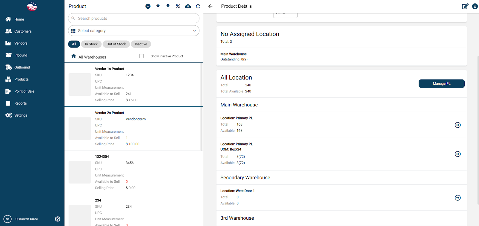 Go to Products > Manage Products and select the product. Here we can see there is 2 rows for this item in the Main Warehouse one line for Eaches and one line for Boxes