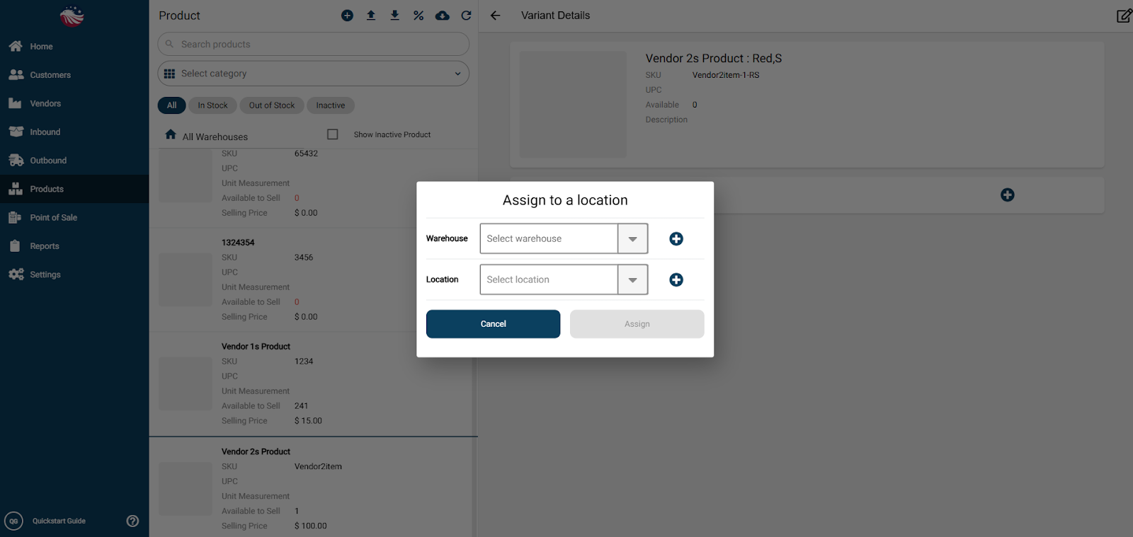 Itβs important to assign each variant to a picking location. To do that, you can click on one of the product line items and click the blue plus icon in the middle of the screen. This allows you to add a picking location to the product.