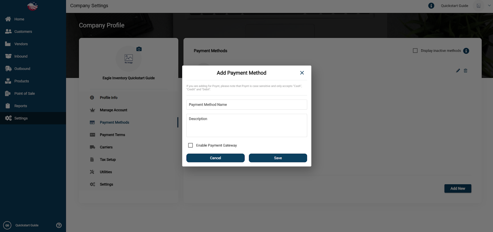 Note: If you are adding a method for Poynt, please note that Poynt is case sensitive and only accepts "Cash", "Credit", and "Debit".