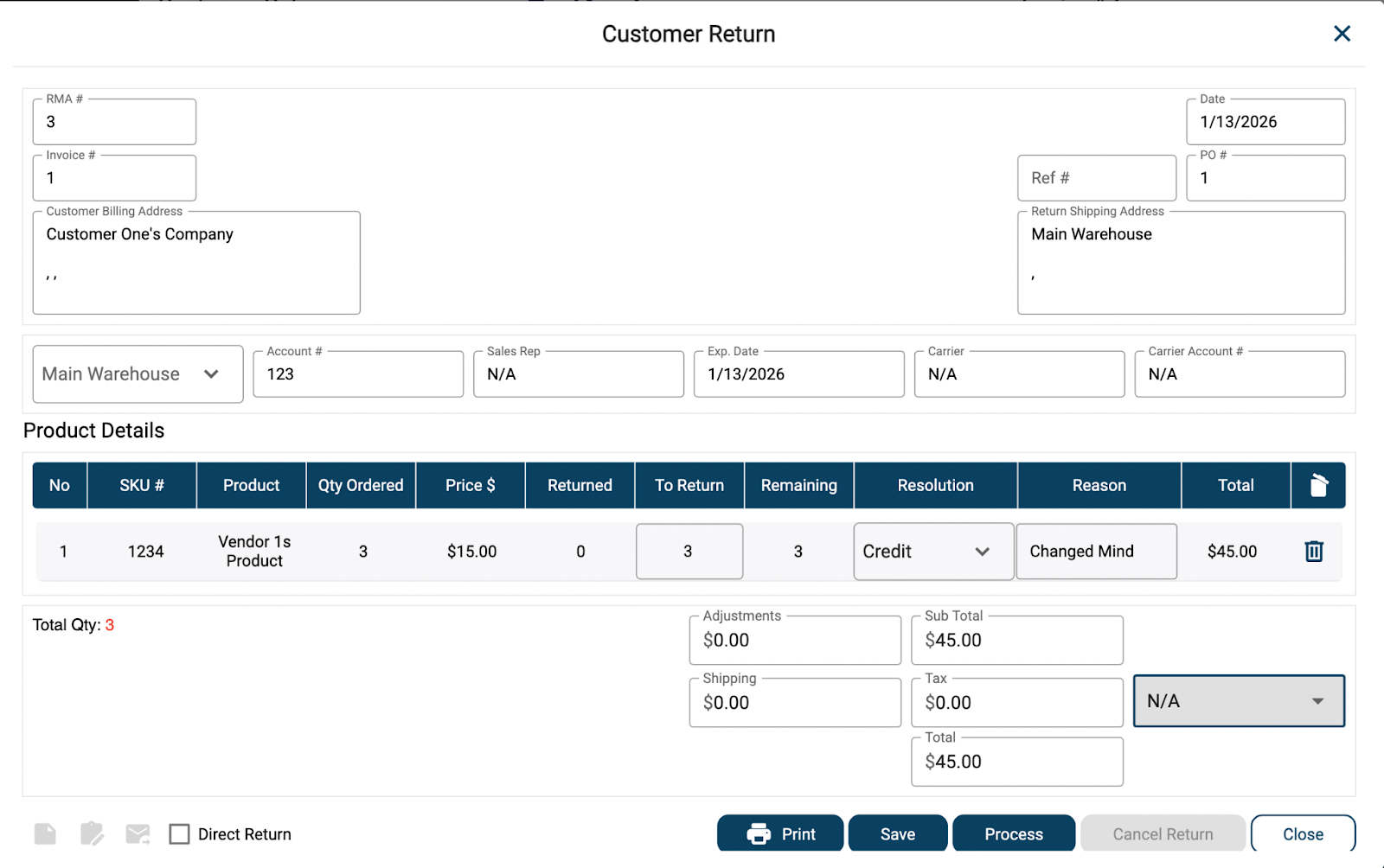 Direct Return: Check this box if the item has already been handled (e.g., destroyed) and skip the warehouse receiving process. Hit Process to finish immediately.