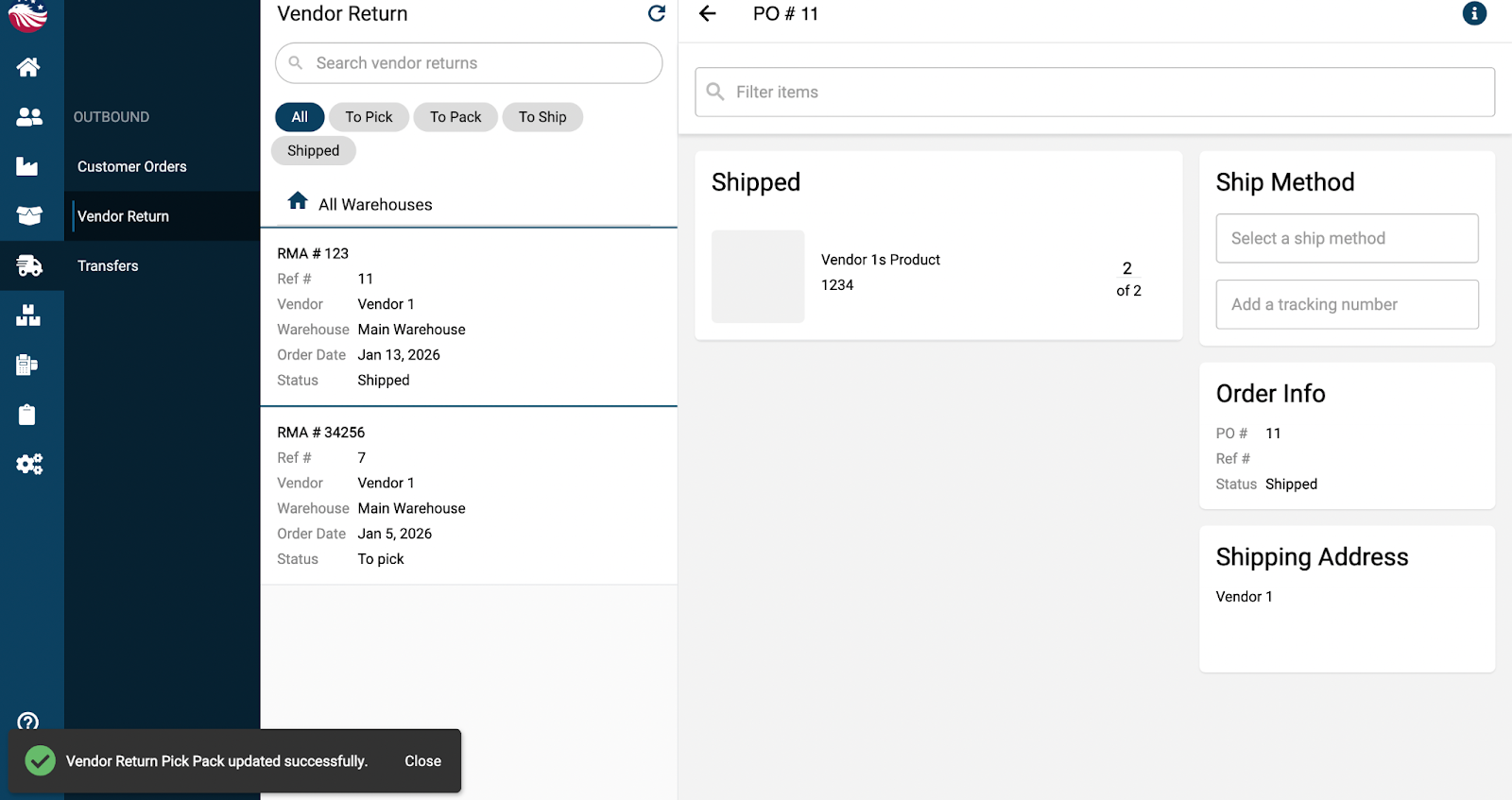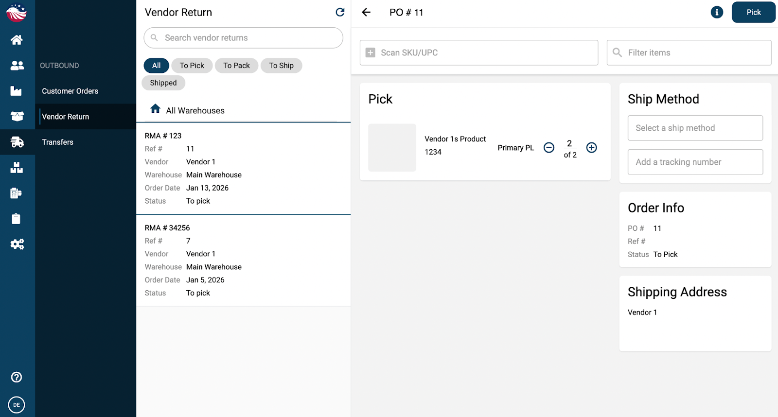 Go to Outbound > Vendor Returns.
